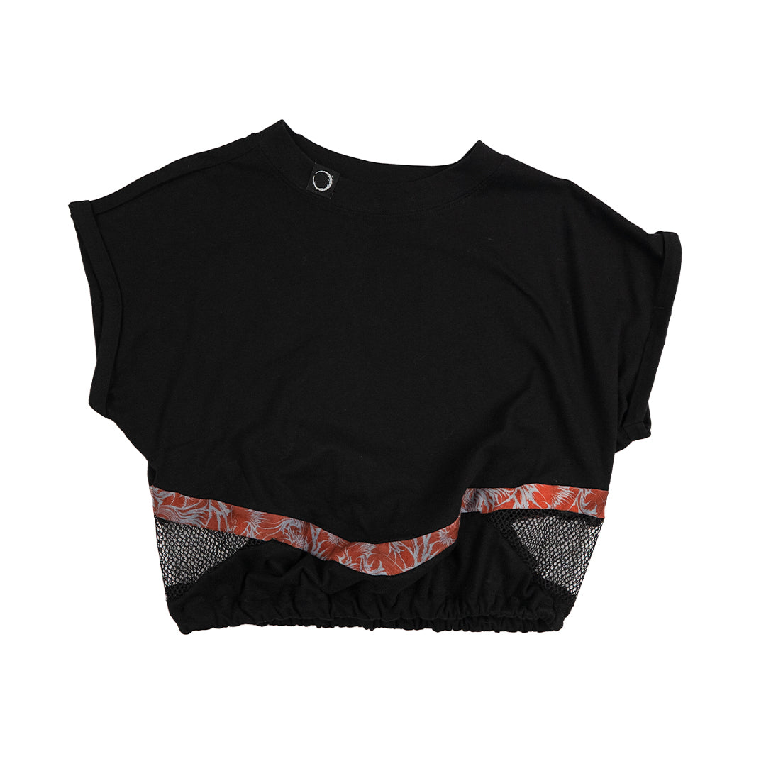 A bold black crop top reimagined through upcycling and handcrafted detail. Designed with a YH fabric insert that adds contrast and character, this piece balances streetwear attitude with functional comfort. Elasticated elements at wrist level create structure and flexibility, making the silhouette dynamic yet easy to wear. Each garment is individually treated through in-house bleaching and dyeing, ensuring a truly one-of-a-kind finish.