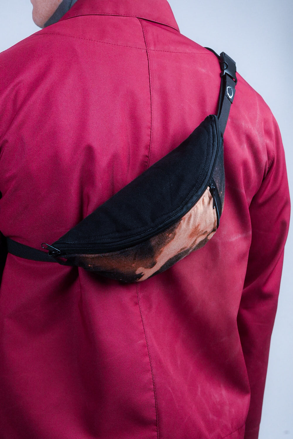 A versatile, sustainable accessory, this fanny pack is handmade from upcycled organic cotton and features a front pocket for essentials. Its black-bleached finish gives each piece a unique, edgy character, making it a statement accessory with practical design.