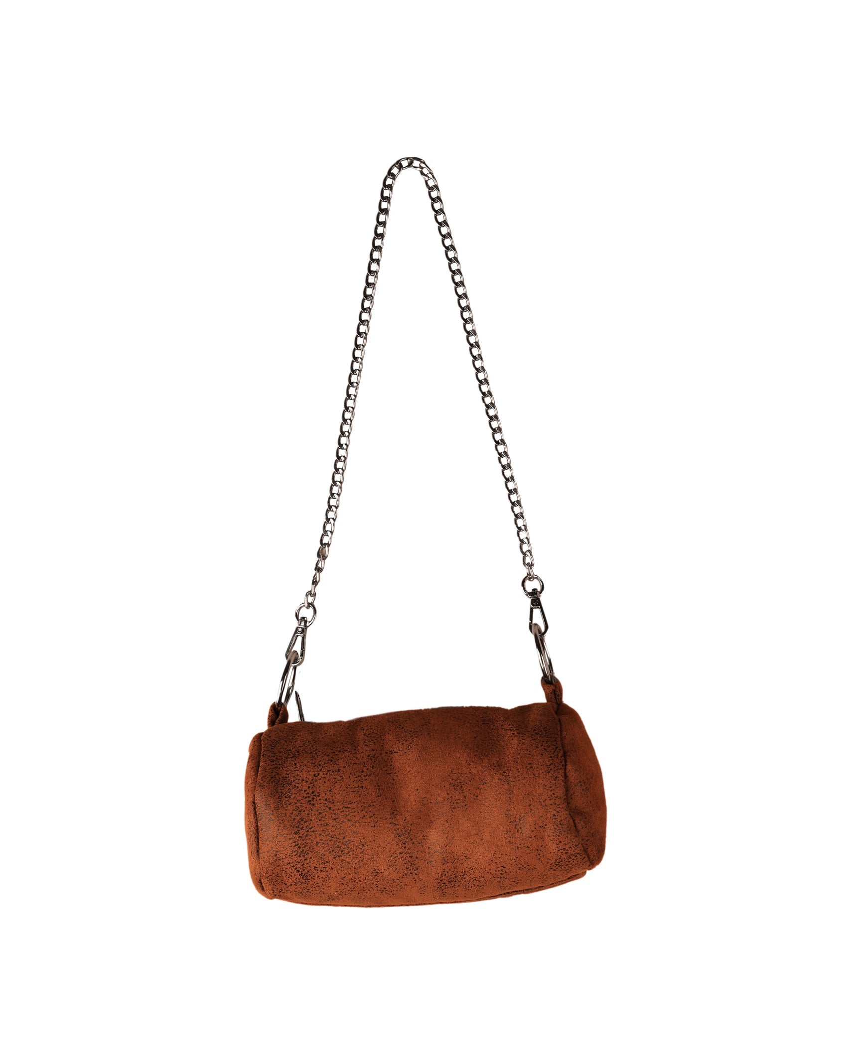 | Cylindrical mini shoulder bag made of rust-colored textured material. The design features a top metal zipper closure and two rings attached to the side panels. It includes a detachable metal link chain with lobster clasps and an internal lining layer. The structure consists of a central body with circular side sections. | |