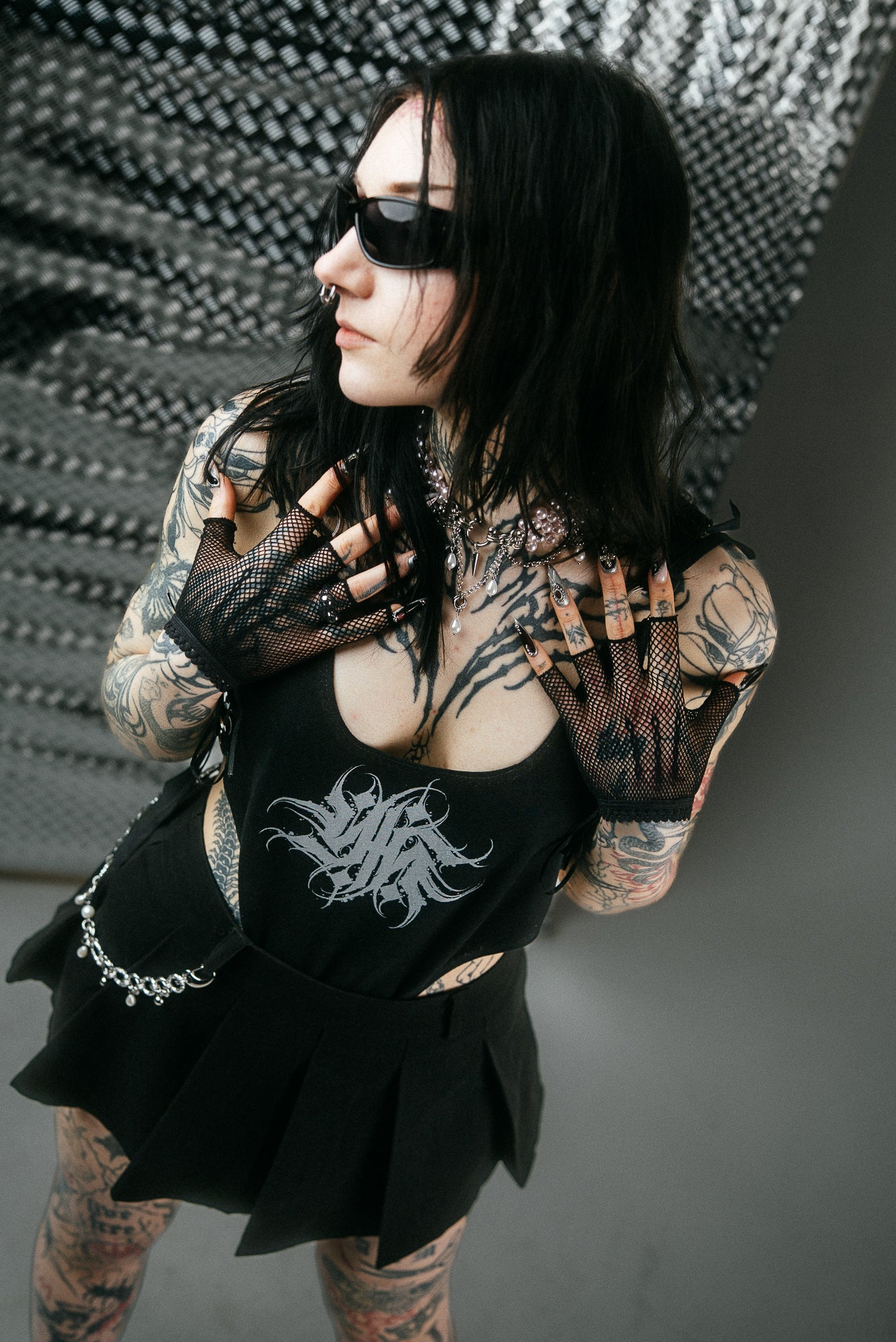 A striking bodywear piece, completely self-sewn and designed to celebrate strength, flexibility, and confidence. Featuring high-cut tights and a deep open back, this garment sculpts the body while allowing freedom of movement. Adjustable side elements and shoulder straps offer customizable sizing and styling, making the fit as personal as the statement it creates. Finished with a printed YH logo, this piece blends sensuality with raw, handcrafted design.