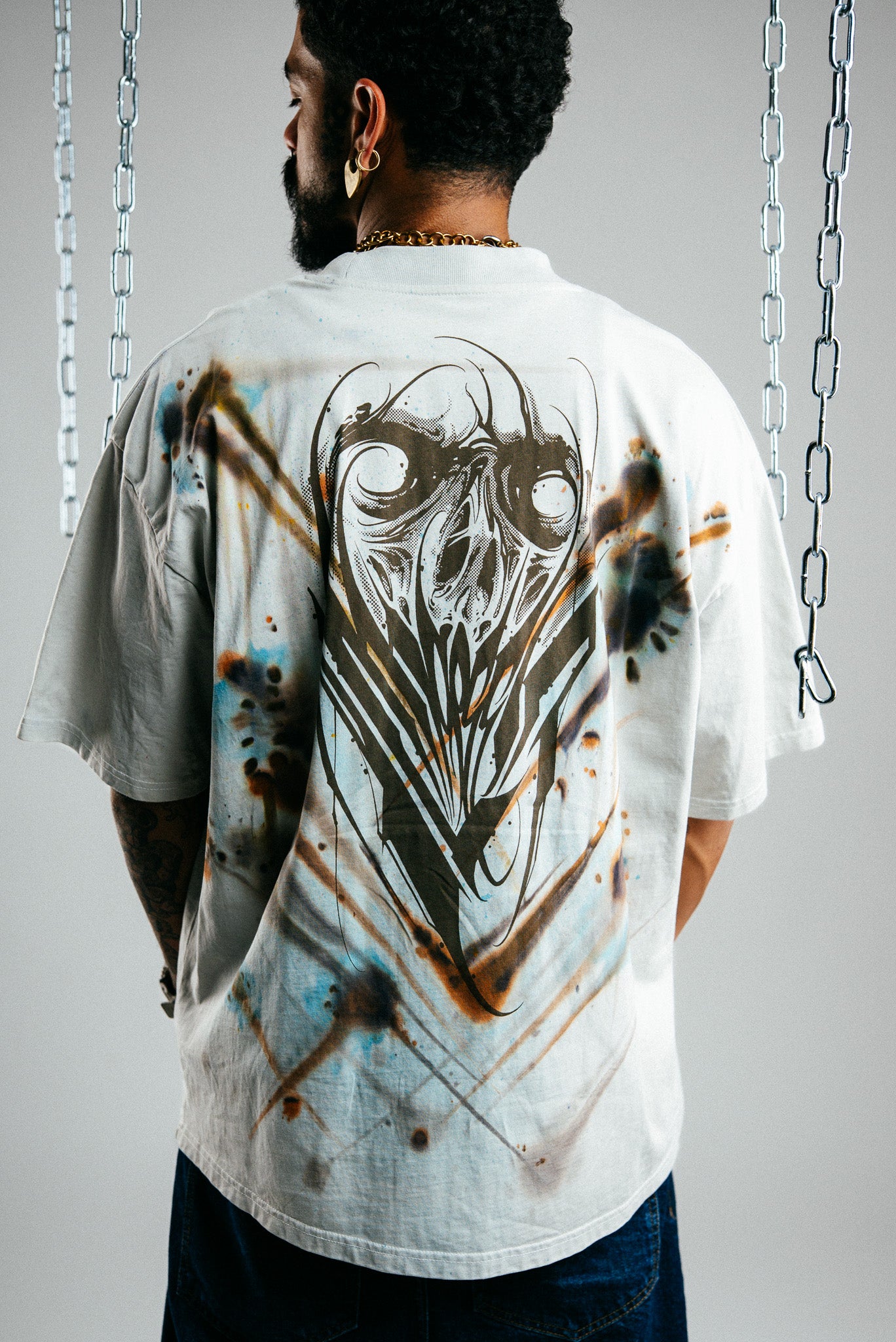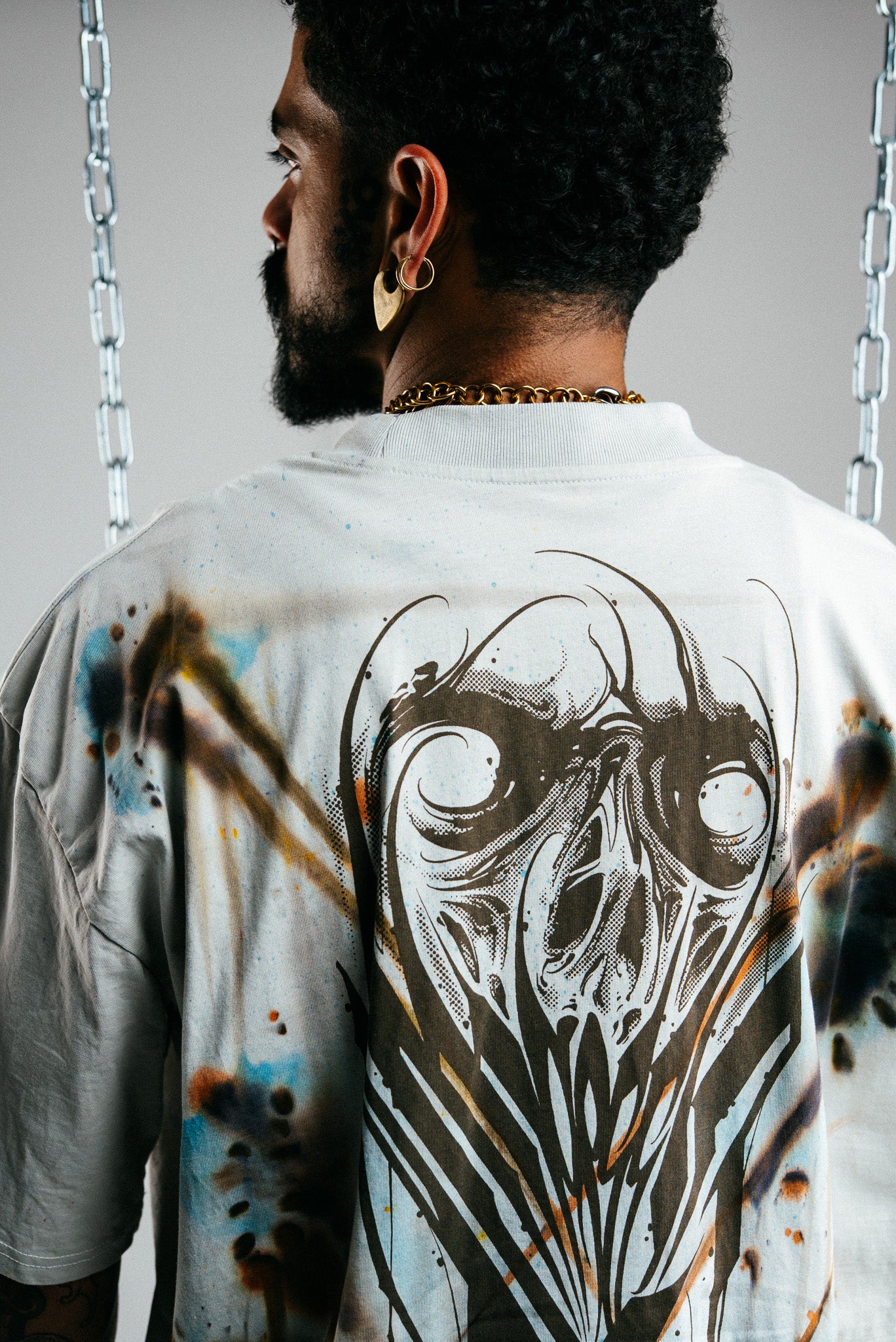 Skull Lettering design on the back, created with a mix of serigraphy and bleaching tints. A statement piece combining streetwear edge with artistic flair.