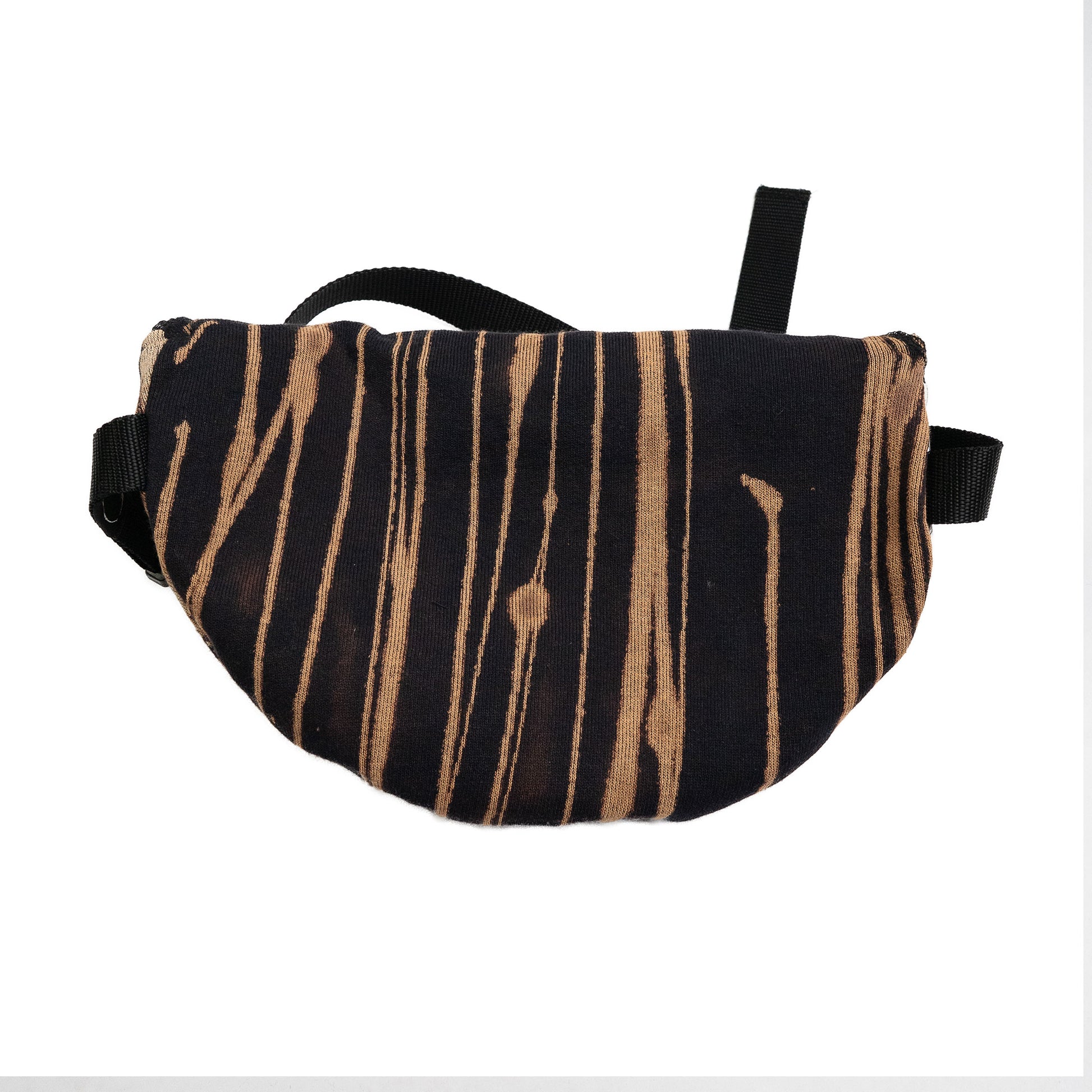 Each fannypack is handmade from reclaimed fabrics, with unique bleaching and coloring effects that make every piece one-of-a-kind.