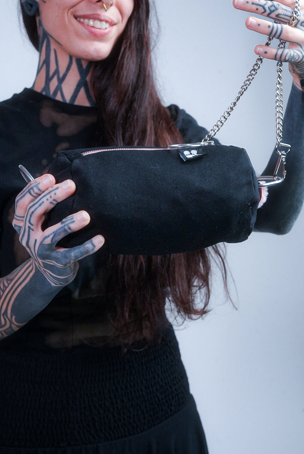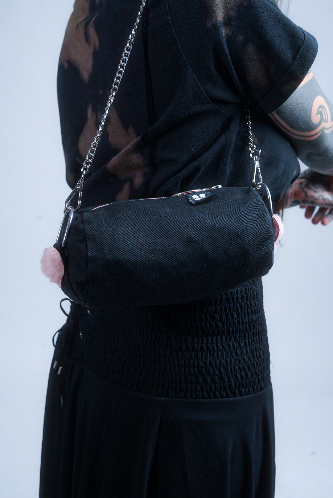 A compact statement piece with a bold, industrial edge. This padded cylindrical mini barrel bag is crafted from black fabric featuring pink fluffy heart shaped patterns.