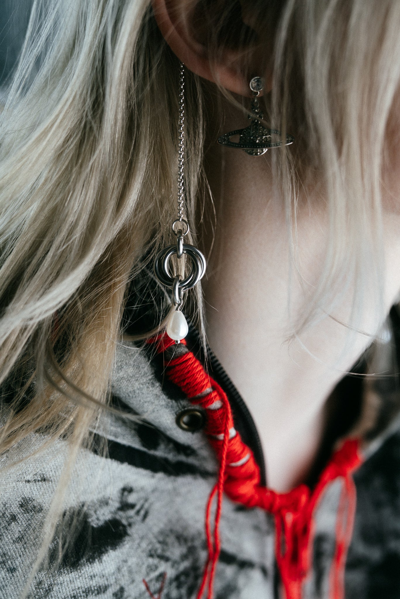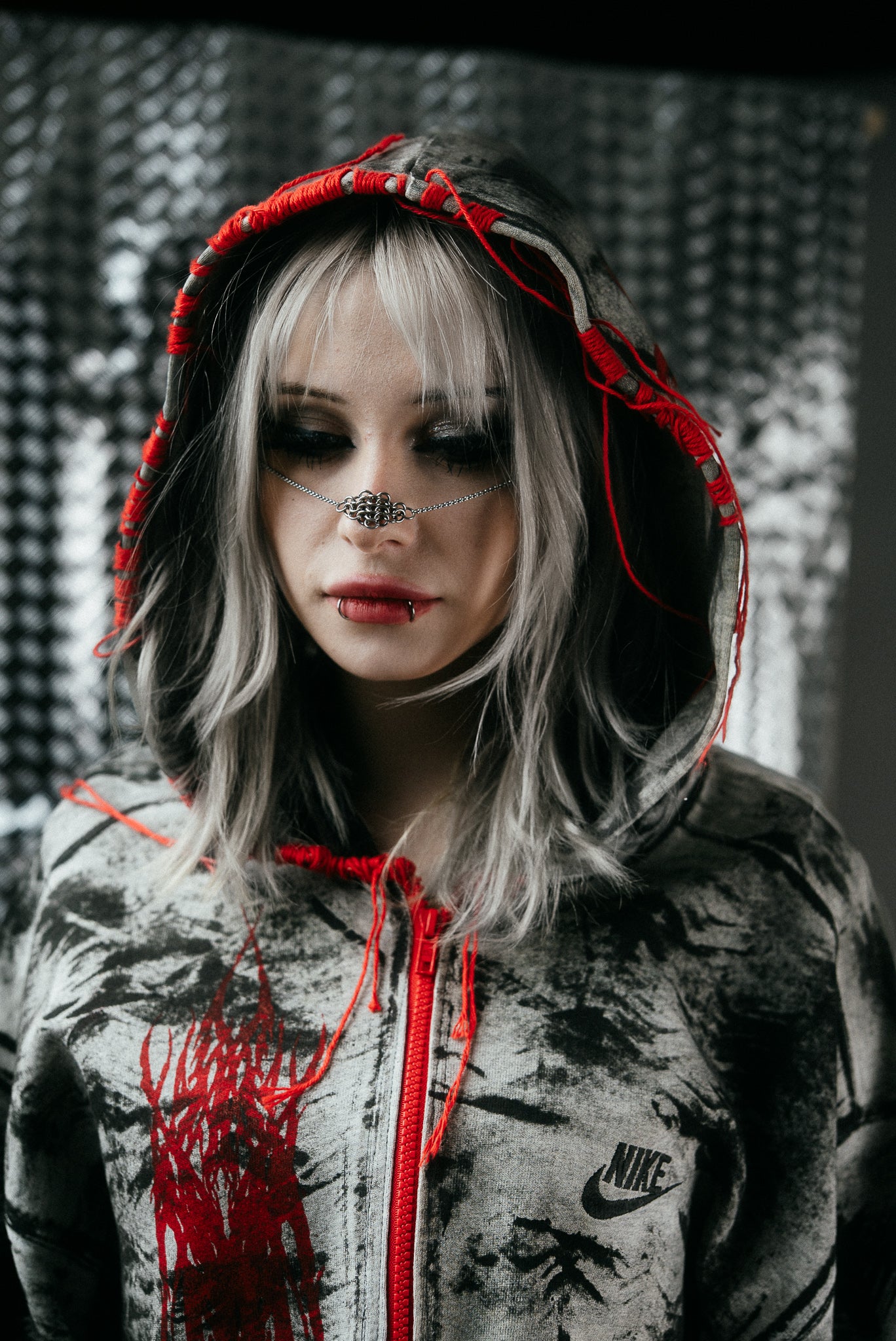 An upcycled Nike zipper hoodie transformed into a bold, sculptural statement piece. Cropped with a sharp silhouette, it features a striking red zipper, hand-painted layers, and screen-printed red designs by REVA × YH. Sewn-on red accents add dimensional detail, while each brushstroke marks a trace of transformation. Every hoodie is entirely handmade, ensuring that no two are alike.